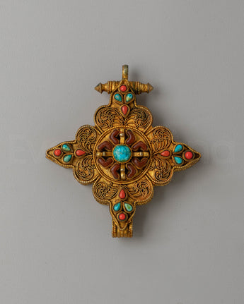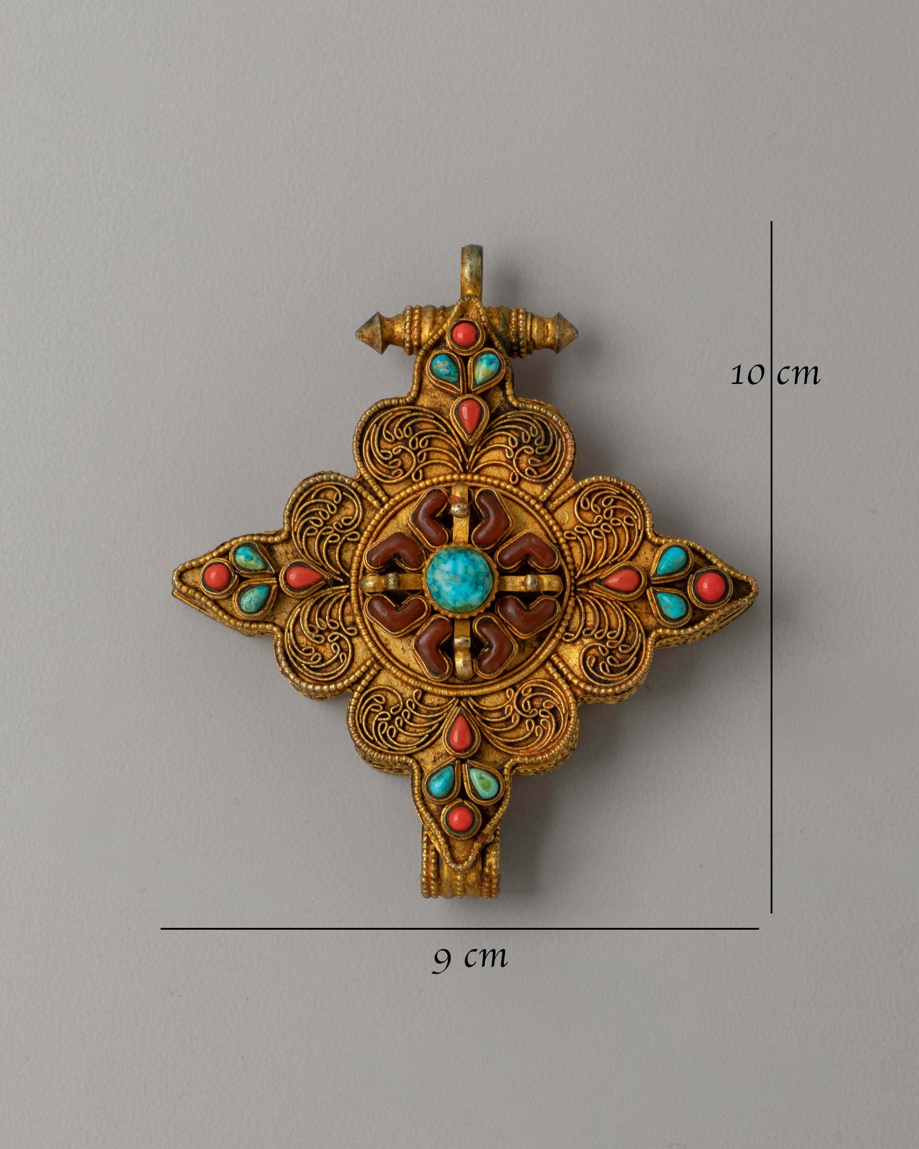 The design of the Electro Gold-Plated Ghau Locket features delicate, finely crafted filigree, with turquoise, coral, and copper elements integrated into the center and corners. The central gemstone is encircled by a stunning design that symbolizes balance and divine energy. The electro gold plating enhances the sacred nature of the locket, ensuring it radiates positive spiritual energy. The gemstones used in the locket are not just for decoration; they are believed to bring balance, healing, and spiritual protection to the wearer.