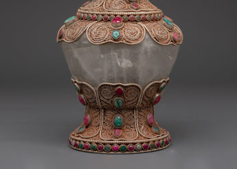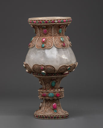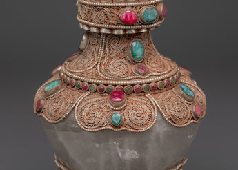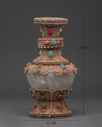 This crystal and copper flower vase is ideal for individuals who value sacred art or luxury design with a spiritual undertone. It is both useful and symbolic.  It is ideal for Buddhist altars, floral offerings, spiritual ceremonies, temple decor, and beautiful centerpieces.  The combination of crystal clarity, copper strength, silver purity, and gemstone vitality makes it an effective tool for individuals seeking to balance aesthetics and spiritual energy.  Elevate your space with elegant home decor, sacred floral displays, and spiritual altar decorations.