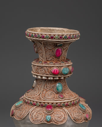This beautiful flower vase exhibits traditional workmanship and cultural heritage.  Its elaborate craftsmanship and gemstone inlays set it apart, whether used for fresh flowers, dried arrangements, or ritual sacrifices.  Its silver-plated surface raises the energy of the environment, which is thought to invite purity, clarity, and spiritual serenity.  Whether you're performing daily rituals or decorating your house, this vase combines beauty and function in a really polished design.  The ruby and emerald stones offer a regal touch while also representing love, vitality, and spiritual richness.