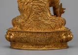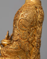 With the help of this exquisitely crafted, 24K gold-gilded copper statue, you may invite the healing energies of the Medicine Buddh into your house or other holy areas. This Medicine Buddha statue, which is 12.5" in height, 8.2" at the base, and weighs 3.63 kg, is the ideal illustration of the superb workmanship of our Vajrayana artists.