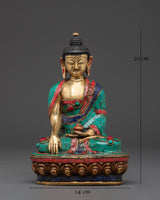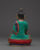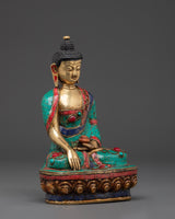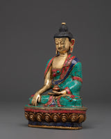 The Enlightened Shakyamuni Buddha Figurine is a stunning spiritual sculpture, ideal for meditation or display on your Buddhist shrine. This statue is handcrafted from brass and embellished with bright coral, Turquoise, and lapis lazuli, with each stone carrying its spiritual significance. With its tranquil countenance and detailed craftsmanship, this Buddha figurine brings peace and wisdom into your home. It serves as a daily reminder to cultivate mindfulness, compassion, and inner peace.