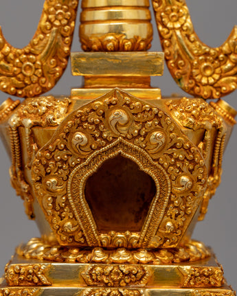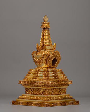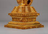 A refined spire rises from the top of the stupa, crowned with a detailed finish that serves as the structure's pinnacle. The use of gold plating enhances the stupa's sacred nature, while the solid copper body ensures its strength and longevity. The overall golden glow represents purity and divinity, providing an ideal balance of material craftsmanship and spiritual significance. This stupa is both a decorative piece and a powerful symbol of the path to enlightenment.