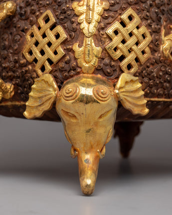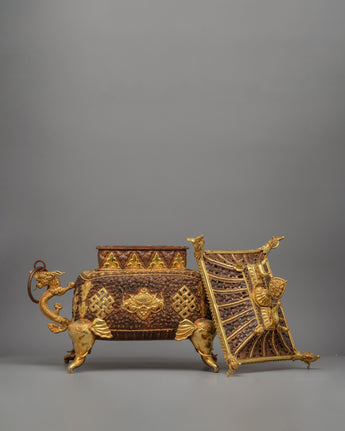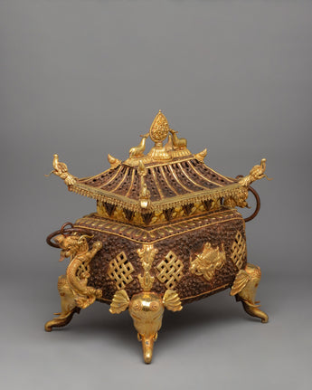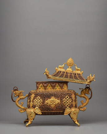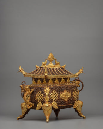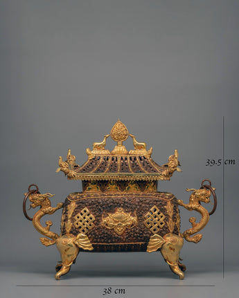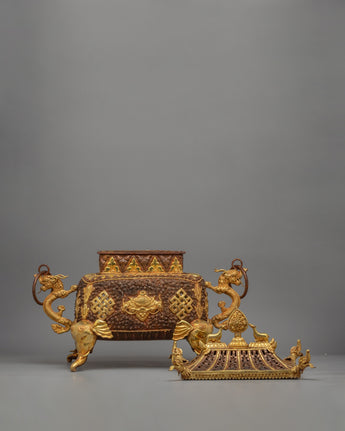 The exquisite gold-plated decorations on this ceremonial incense burner include Tibetan connections, dragons, and elephants, all of which have strong symbolic effects. The elephant represents knowledge and wealth, while the dragon, a highly respected guardian in Tibetan culture, signifies power and wisdom. As the construction is made to allow for enough breathing, the incense burns smoothly and regularly, promoting a calm and focused environment. Thanks to its strength and fine craftsmanship, It is a helpful ritual tool and an attractive Buddhist artwork.