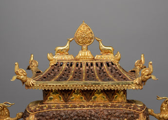 An exquisitely created artifact for Buddhist ceremonies and meditation, this Exquisite Buddhist Incense Burner will elevate your spiritual space. With its elaborate carvings and auspicious Buddhist symbols, this magnificent item, made from a copper body and electroplated in gold, reflects the exquisite cultural legacy of Tibetan handicrafts. At 39.5 cm in height and 38 cm in breadth, it is a stunning attraction for any temple, meditation space, or altar. The finely carved patterns and engraved decorations symbolize spiritual enlightenment, protection, and divine benefits.