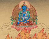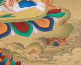 The four-armed Butadamara Vajrapani thangka is hand-painted on fine cotton canvas with natural Lhasa stone pigments and genuine 24K gold. The pigments add a subtle vibrancy tied to the earth’s energy, while the gold accents highlight Vajrapani’s divine aura. Created in the traditional Karma Gadri style, recognized for its detailed linework, luminous composition, and peaceful spatial arrangement, this thangka blends artistic skill with spiritual depth. Every brushstroke shows devotion and precision, embodying authentic Himalayan workmanship and sacred artistry.