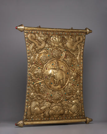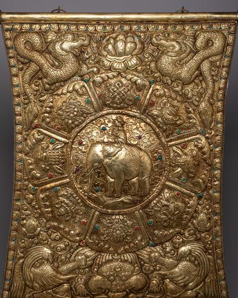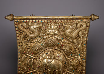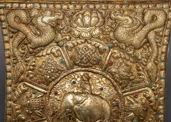 The Four Harmoniuos Friends A fascinating work of spiritual art painstakingly fashioned on brass is the Metal Thangka. The Four Harmonious Friends, an old Buddhist story that stands for cooperation, harmony, and respect for one another, are depicted at the heart of the painting. The piece's visual appeal and spiritual importance are further enhanced by the auspicious symbols that surround the primary motif.