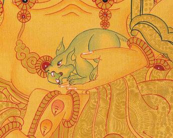 Zambala sits on a lotus, holding a mongoose named Nehulay, which spews forth precious jewels and ornaments. He is said to be able to grant wishes and help increase financial abundance.