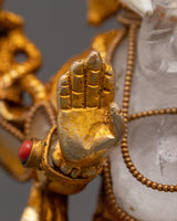 This magnificent Ganesh Crystal Sculpture is 15cm tall and weighs 0.694kg. It is expertly carved from copper and features a gold-plated finish with crystal accents. Ganesh, the renowned remover of barriers and the deity of the beginning is respected for blessings of prosperity, knowledge, and fortune. This sculpture encapsulates his spiritual nature, making it a practical addition to any meditation area, home altar, or sacred nook.