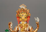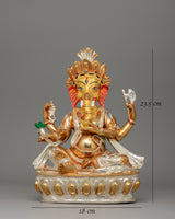 This copper Ganesh Hindu deity statue is meticulously crafted and finished with electro-gold and electro-silver plating, giving it a striking, radiant appearance. The acrylic accents bring Ganesha's features to life, enhancing the figure's divine presence. Standing 23.5 cm tall and 18 cm wide, this statue strikes an elegant balance of grandeur and grace.