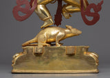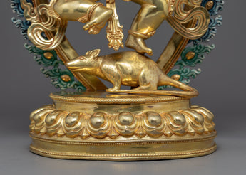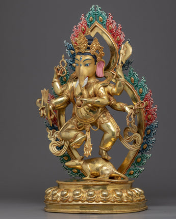 Traditionally crafted, this Ganesha Statue is coated in a thick sheet of genuine 24k gold and to highlight the details the artists have painted the statue with acrylic paint in our studio, Kathmandu. The deity is depicted standing upon Mooshak his vaahan or vehicle. The depiction of Mooshak depicts the Ganesha's ability to overcome anything to get what he wants. Like a rat and like an elephant, Ganesha is a remover of obstacles. He has an elephant face with three eyes. His eyes are symbolic of wisdom and enlightenment. He is depicted with four hands in which he holds a lotus in one hand, a representation of enlightenment. He is holding a hatchet with his other hand.