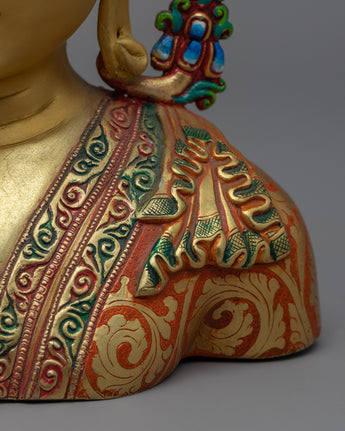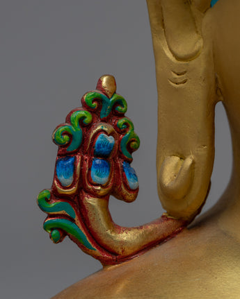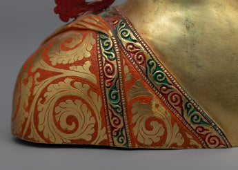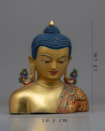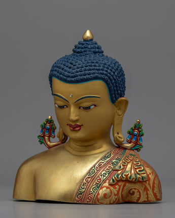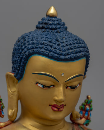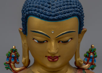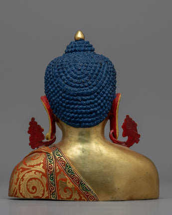 The statue is hand-carved from copper and then plated in 24K gold for a luxurious and elegant appearance. The statue also includes acrylic painting, which adds depth and dimension to the intricate carvings of the Buddha's facial features. It would look lovely in any garden or outdoor space, serving as a peaceful and calming reminder of Buddhist teachings.