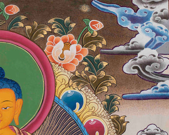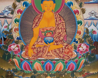 This Shakyamuni Buddha Thangka shows Siddhartha Gautama's enlightened form. The painting shows Shakyamuni Buddha sitting on a lotus seat, exuding spiritual wisdom and compassion. His right hand touches the ground, signifying enlightenment, while his left hand rests in the dhyana mudra, representing intense concentration. This Shakyamuni Thangka encourages practitioners to meditate and devote themselves. As a focal point for meditation and prayer, the thangka encourages devotees to make efforts for enlightenment by embodying the everlasting teachings of compassion, wisdom, and preventing suffering.