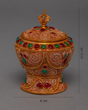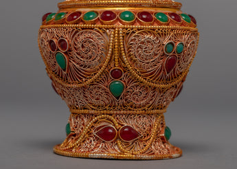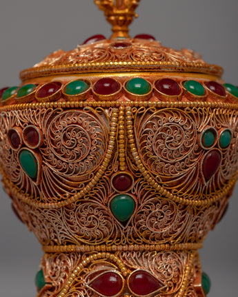 This jar is a stunning example of traditional craftsmanship, handcrafted from copper and lavishly plated in 24k gold. The gemstones carefully embedded in the jar add to its overall beauty and elegance, transforming it into a true work of art. The jar's one-of-a-kind and intricate design demonstrates the skill and creativity of the artisans who created it. This piece is not only beautiful to look at, but it also has significant cultural and spiritual significance in many traditions.