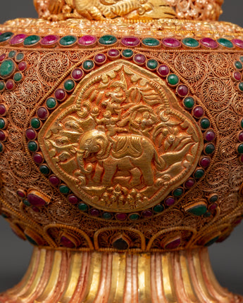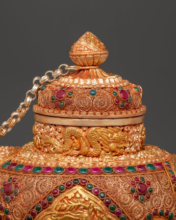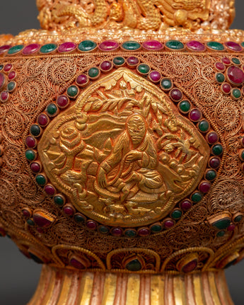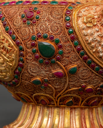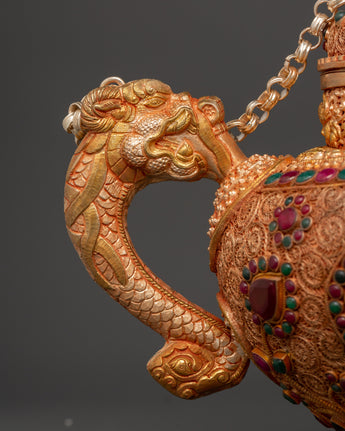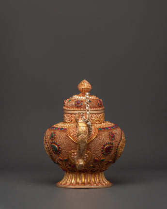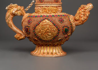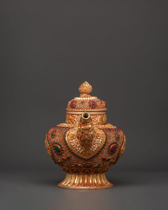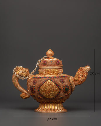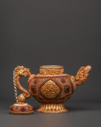 Crafted from copper with a gorgeous gold coating, this teapot weighs 2.94 pounds, making it a vessel to feel. The elaborate gemstone embellishments represent protection and healing, elevating this teapot from a vessel to a meaningful relic for meditation and ceremonial use. Experience the spiritual significance and classic beauty of this Tibetan tea pot, ideal for individuals who appreciate craftsmanship and tradition. Enhance your tea experience with this unique gemstone-embellished teapot, designed for both aesthetic and practical purposes.