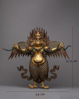 Presenting the magnificent handcrafted Garuda God Wall Hanging embodies the regal might and spiritual importance of the sacred eagle found in Buddhist and Hindu mythology. This wall hanging is an astounding 47.5 cm high, with a gorgeous gold coating and a copper body. The extraordinary craftsmanship and profound care with which this sculpture was made are evident in the minute details of Garuda's furious countenance, strong wings, and regal stance.