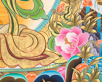 Our Thangka is a hand-painted art of Goddess Green Tara. At the center of the painting we can see the Goddess Green Tara seated on her lotus throne. Our thankga comes with a brocade which can be a perfect wall art decor for you.