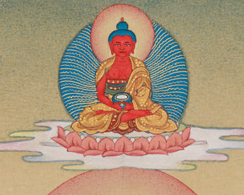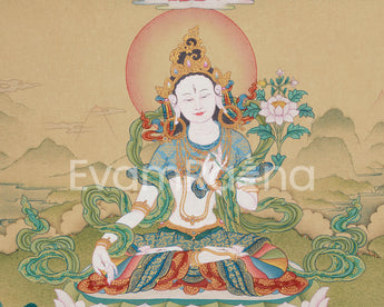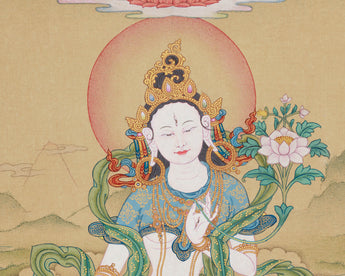 In Vajra's posture, White Tara is depicted sitting gracefully on a lotus seat atop a moon disc, symbolizing enlightenment and purity. She represents her unwavering wisdom and compassion by holding a pundarika (lotus flower) between her thumb and ring finger. Her five-jeweled crown further emphasizes her celestial position, which signifies her attainment of the five ultimate wisdoms. Her seven eyes, which embody her omniscient vision and ability to perceive all suffering beings in need of her blessings, are on her forehead, two on her palms, and two on the soles of her feet. White Tara's role as a healer and protector is further reinforced by the spiritual wisdom and compassion flowing from Amitabha Buddha, the Buddha of Infinite Light, above her. This artwork is perfect for practitioners, collectors, and places of worship, as it fosters inner peace, wisdom, and healing.