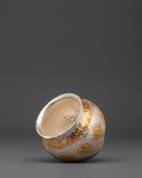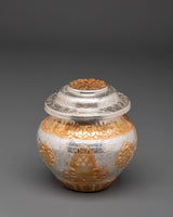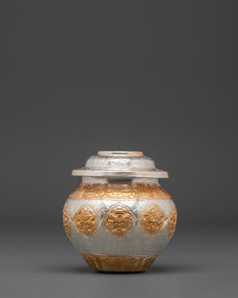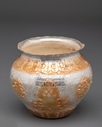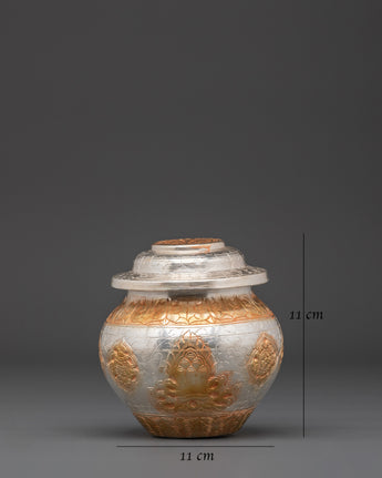 This exquisitely handcrafted Gold and Silver Plated Ritual Rice Pot will elevate your spiritual rituals.  This sacred vase, crafted from copper and meticulously polished with bright gold and silver plating, is typically used in Buddhist and Hindu ceremonies to store rice offerings, which symbolize abundance, prosperity, and sacred blessings. With dimensions of 11cm in height and breadth and a weight of 0.86kg (single), it can be used as both a spiritual instrument and a decorative piece for your altar, meditation place, or ceremonial setting.