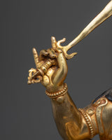 This Manjushri Meditation Statue is a finely handmade piece made in our workshop with distinctive Nepali designs. The bodhisattva can be seen sitting on a moon disc lotus seat with a benevolent look and a fiery sword, signifying his capacity to slay ignorance and negativity. He makes the "Vitraka Mudra" with his right hand, which stands for the Buddha's teaching being delivered. After months of labor, our painters created this stunning sculpture, and adding gems only enhances its beauty.