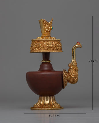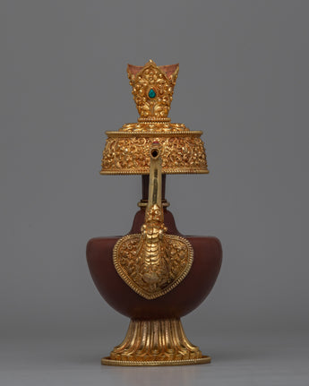 The Bhumba, or Ritual Vase, is an essential ceremonial item used for holding holy water that the Guru has blessed. These are called the “chief” or “principal” vase and the “action” or “working” vase. The principal vase is filled with holy water and remains upon the altar in the monastery or temple, while the action vase is used for the actual pouring of water for purification during the various stages of the ritual.