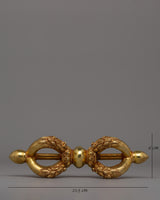 Discover the Gold-Plated Vajra Ritual item, a respected ritual item in Tibetan Buddhism, and its eternal beauty and spiritual significance. This 21.5cm Dorje, made of a copper body and beautifully plated with gold, represents indestructibility and the union of compassion and knowledge. Its shape and weight of 1.15 kg make it the ideal focus for rituals and meditation activities, or it can be used as an elegant piece of décor in your spiritual space.