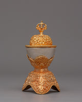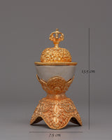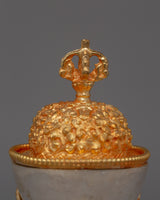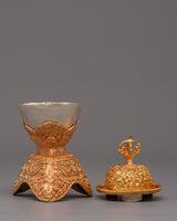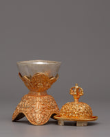 The Kapala set holds the nectar used for performing higher esoteric rituals. It offers liberation to gods and deities to ensure their devotion. It is said that the offerings will be transformed into the Wisdom Nectar, a liquid form of the Enlightened Mind of the Deity.