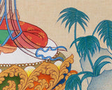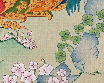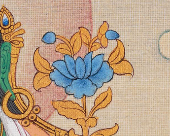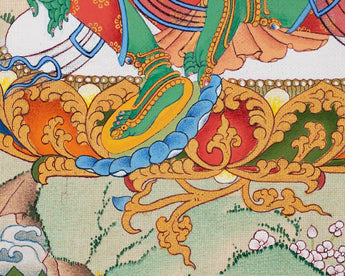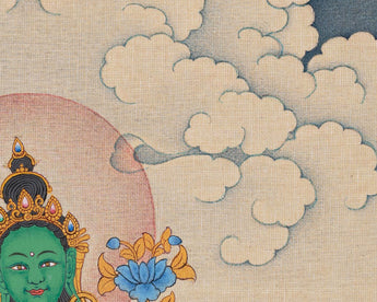 A masterpiece of compassion and wisdom, the Green Tara Thangka is meticulously created with reverence using holy materials and in the prestigious Karma Gadri style. The canvas, which is made of the purest cotton and represents simplicity and purity, is the sacred base upon which the divine manifestation of Green Tara is placed. The natural stone colors are carefully selected and ground in accordance with the rich artistic principles of Karma Gadri. This gives the Thangka energy and depth while wrapping the essential attributes of the deity. Every stroke in this sacred style has a spiritual meaning that emphasizes Green Tara's nurturing and compassionate nature. Thoughtfully applied, 24-karat gold adds a radiant glow to key elements of the Thangka, enhancing its luxurious feel and spiritual symbolism.