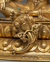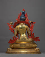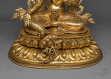 This glorious statue has a copper body that has been skillfully crafted and is gilded in 24K gold. Vibrant gold and acrylic paintings accentuate the fine details of Green Tara's expression and the elaborate patterns on her clothing, giving the picture more depth and vitality. The embedded jewels, which represent the spiritual significance of Green Tara, lend a touch of heavenly splendor. Its impressive presence and weight of 13.62 kg make it perfect for any area used for spiritual development, meditation, or introspection.