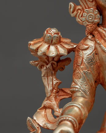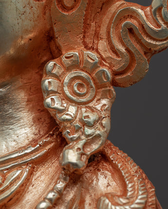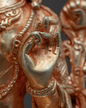The Green Tara Gold statue has been expertly hand-carved in the traditional Himalayan manner. The statue was made with a copper body and then plated with genuine gold, highlighting the exquisite design patterns. She can be seen making the "Prithvi Mudra" with her right hand and the "Generosity Mudra" with her left.