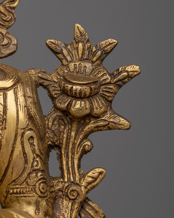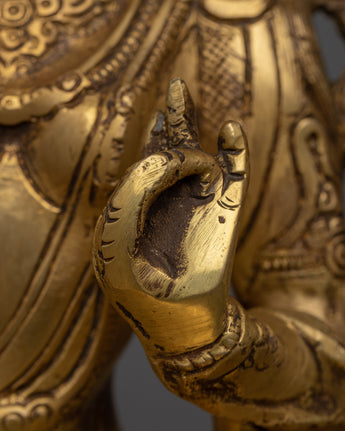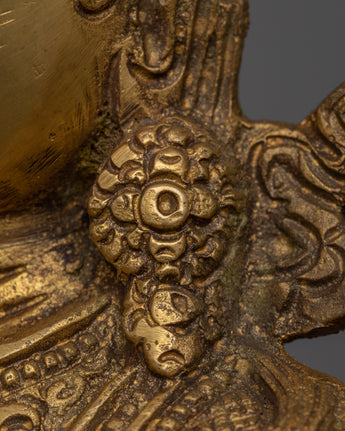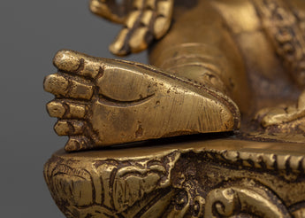 The Green Tara Buddha Statue is meticulously handcrafted on a brass body, demonstrating the artisans' skill and dedication. Green Tara is a revered Buddhist figure known for her compassion and nurturing qualities. Green Tara is depicted in a seated posture, gracefully resting on a lotus base. The use of brass as a material adds beauty and durability to the statue, while the intricate details capture Green Tara's serene expression and divine presence. This handcrafted masterpiece is a symbol of compassion, healing, and protection, reminding Buddhist practitioners of the qualities and teachings embodied by Green Tara.