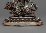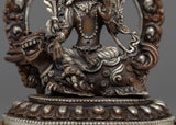 With this beautiful statue of Green Tara Devi, decorated with silver plating and painstakingly machine-made on an oxidized copper body, you can embrace her caring presence. This statue, which measures 12.5 cm in height and 9.5 cm in breadth, exudes spiritual beauty and elegance. It offers a large and significant touch to any religious area, weighing only 0.54 kg.