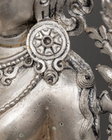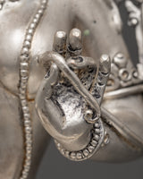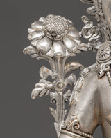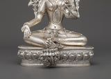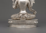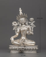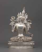 Handcrafted from copper and delicately silver-plated, this 2.348kg Green Tara idol oozes spiritual meaning and artistic beauty. The rich detailing of her tranquil expression and flowing robes adds to the holy spirit of this statue. Whether put on a Buddhist altar, meditation area, or sacred shrine, this Green Tara figurine inspires dedication, inner serenity, and attention.
