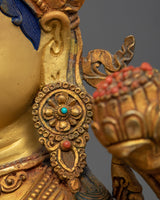 The Green Tara Gold Plated statue is beautifully crafted by our craftsmen, with the most detail given to the crown, which adorns her head covered in multicolored jewels and elegantly embellished ornaments. Carved from a copper statue and gilded with 24k genuine gold. The statue depicts the deity seated over a moon disc lotus which represents purity, her left hand is making the Surya Ravi mudra which symbolizes energy and health, providing a feeling of balance, and the other rests on her left knee. The statue took us months of hard work to complete.