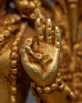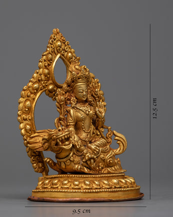 This exquisite statue of Green Tara, painstakingly machine-made on a copper body and exquisitely painted in 24k gold, invites you to embrace her healing energy. This statue, which stands gracefully at 12.5 cm in height and 9.5 cm in width, is full of spiritual power and beauty. It adds a significant and weighty presence to any religious area at 0.55 kg.