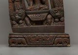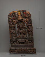 The hand-carved wooden sculpture of Green Tara In throne, the beloved Buddhist goddess of compassion and protection. The meticulous detailing is accentuated with brilliant acrylic colors, highlighting the figure's depth and significance. Green Tara sits in a tranquil, poised position on a magnificent throne, flanked by two Nagakanyas (serpent deities) perched gracefully at the top. The stupa in the center adds to the piece's religious aspect by representing enlightenment and spiritual liberty.