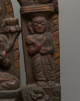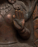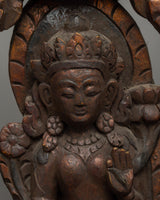 Two animal-like god heads support Green Tara's seated stance and serve as the throne's base. The delicately sculpted magical entities give the statue a sense of power and heavenly protection. Two other deities flank Green Tara, making a balanced and harmonious ensemble that reinforces her divine character. These individuals add to the sculpture's artistic splendor and highlight Green Tara's spiritual entourage as a compassionate protector.