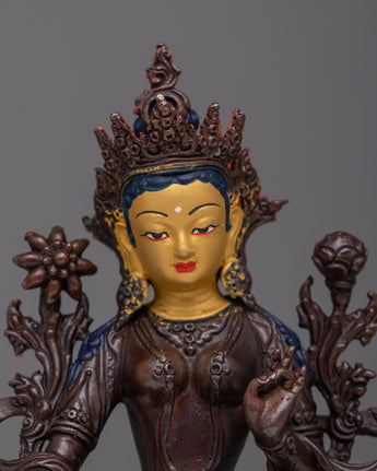 Introducing our Green Tara Machine Made Statue, a stunning representation of the respected Buddhist deity known for her compassion and quick action. This statue emanates beauty and grace, having been meticulously crafted on a copper body. Green Tara's delicate features are highlighted by bright 24k gold electroplating, which adds a touch of exquisite brilliance to her appearance.