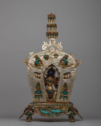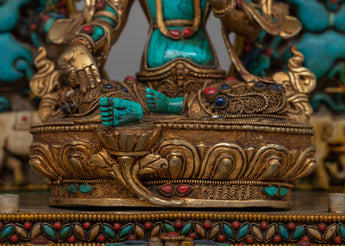 Within Buddhist tradition, the Green Tara Prayer Statue is revered as a sign of compassion and protection. Green Tara is depicted in this exquisitely crafted statue, which is constructed of turquoise stone and represents her nurturing and compassionate nature. The statue is further embellished with coral, turquoise, and lapis lazuli stones, which enhance its spiritual beauty.