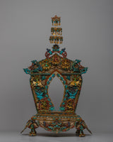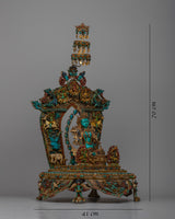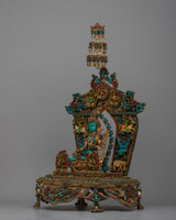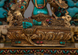 The statue's 24k gold-plated parts are expertly carved from copper, giving the design an air of grandeur and respect. With a throne embellished with finely carved animal motifs, Green Tara is portrayed sitting atop a rectangular base, signifying her heavenly presence and bond with the natural world.