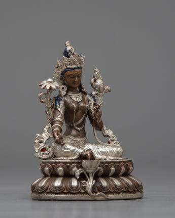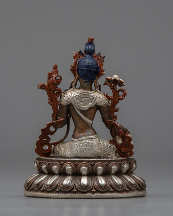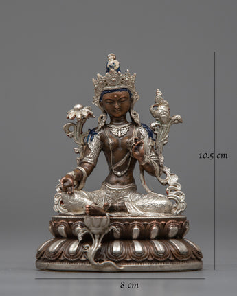 The Nepalese Green Tara Statue is a striking representation of kindness and defense. This statue is machine-made on an oxidized copper body and completed with electro-silver plating. It is crafted with great attention to detail. Measuring 10.5 cm in height, it displays the elegant figure of Green Tara, a highly esteemed deity in Tibetan Buddhism who is renowned for her prompt action in easing suffering and fulfilling requests.