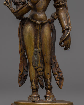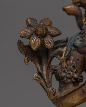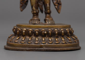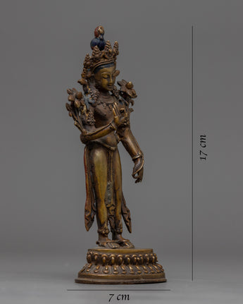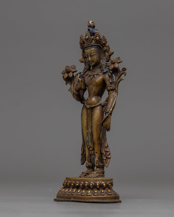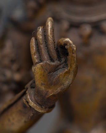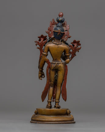Introducing the Green Tara Tibetan Statue, an enduring representation of kindness and defense. This carefully crafted statue has an oxidized copper body that gives it a rustic charm. It is 17 centimeters tall and has a presence that evokes awe and devotion.