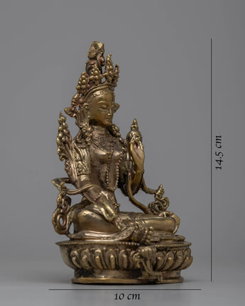Standing at a height of 14.5 cm, the Green Tara Tibetan Statue is a beautiful example of grace and compassion, meticulously crafted from brass.