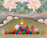 Guru Rinpoche, Buddha of Vajrayana is seated peacefully in a lotus with a vajra in his right hand and a skull cup in his left. His inner clothing is white, representing the mind's bright light aspect, while his outer garment is brown, meaning his sacrifice. With lush slopes and water flowing from the mountains towards the lake, the Thangka emanates azure water filled with lotus and a giant lotus for Guru.