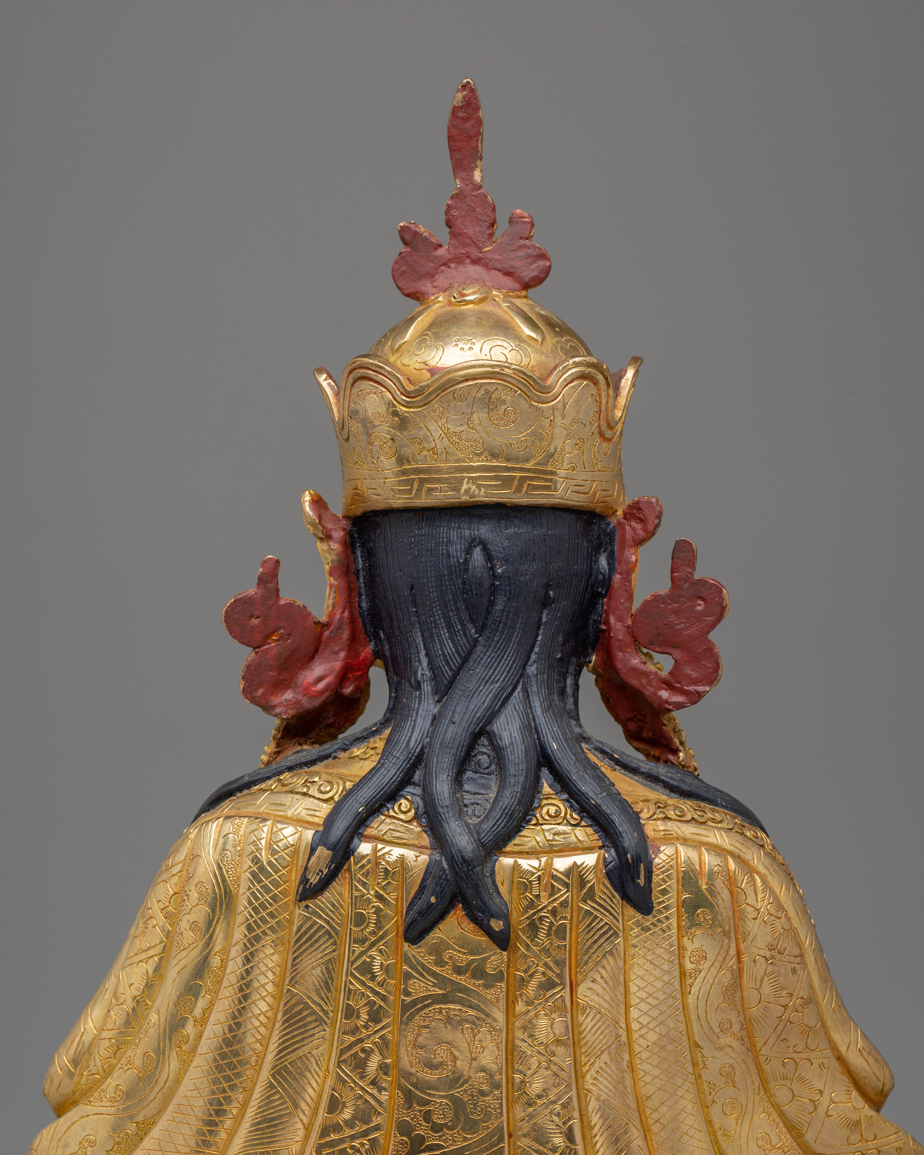 The design of the Guru Tsokye Dorje Statue captures the powerful energy of the deity, with Guru Tsokye Dorje seated in a dignified posture, embodying tranquility and enlightenment. The copper body offers a rich, grounding presence, while the 24K gold gilding adds an aura of purity and divine energy. The acrylic colors bring vivid life to the robes and details of the statue, highlighting its intricate craftsmanship and enhancing the spiritual beauty of the piece. The combination of these materials ensures the statue radiates both visual elegance and profound symbolism.
