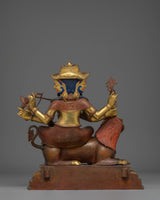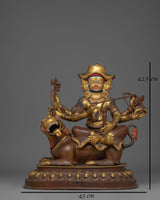 This Pehar Gyalpo Figurine, measuring 42.5cm, is a stunning depiction of the great guardian deity. The figure, made of pure copper, is beautifully gilded with gold-plated, emitting a holy presence. The exquisite acrylic paints highlight the angry attitude and rich adornments, providing artistic depth and bringing this figure to life.