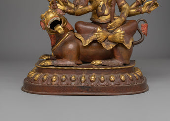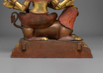 The materials used in this statue are high-quality, and we assure you that it will last a long time. The deity is depicted with three heads while riding upon a mythical snow lion representing youthful energy. With six arms, the three right hands hold a sword, an arrow, and a hammer, and wield a stick, a bow, and a knife, surrounded by a fire ring. In traditional iconography, he is seen in white color, Wrathful and fierce. With the right face red and the left face blue.