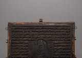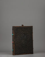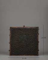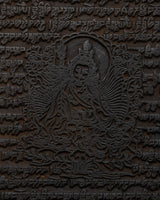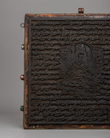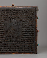 The Hand-Carved Flag Stamp of Guru Rinpoche is an extraordinary artifact combining traditional craftsmanship and spiritual significance. Featuring an intricate carving of Guru Rinpoche (Padmasambhava), this piece is a testament to the skill and dedication of the artisans who created it. The central panel is crafted in wood, showcasing fine details of scriptural texts and a striking depiction of Guru Rinpoche surrounded by flowing lines of sacred mantras, symbolizing his divine power and blessings. The copper frame enhances its aesthetic appeal and provides structural durability, making this piece a long-lasting addition to any collection or shrine.