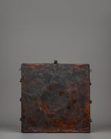 This flag stamp holds a commanding presence of 32 cm in height and 31 cm in width. At 1.76 kg, its substantial weight underscores its authenticity and the meticulous craftsmanship behind it. The copper frame is adorned with subtle accents, including small gemstone embellishments, that add vibrancy and elevate its sacred aura. The reverse side features an aged wood finish, exuding a sense of history and reverence. Designed for practical and spiritual purposes, this piece serves as a functional tool for imprinting prayer flags, while also being a standalone decorative and devotional item.