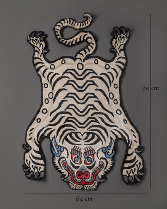 Enhance your interior with the Hand Knotted White Tiger Rug, a distinctive combination of artistic skill and rich cultural meaning. Sized at 99cm x 64cm and weighing 1.10kg, this beautiful rug is crafted from 100% Tibetan and New Zealand wool, providing outstanding softness and warmth. Featuring a striking white tiger design—a symbol of protection, power, and courage this rug serves as a stunning centerpiece that celebrates traditional Tibetan craftsmanship and adds character to any space.