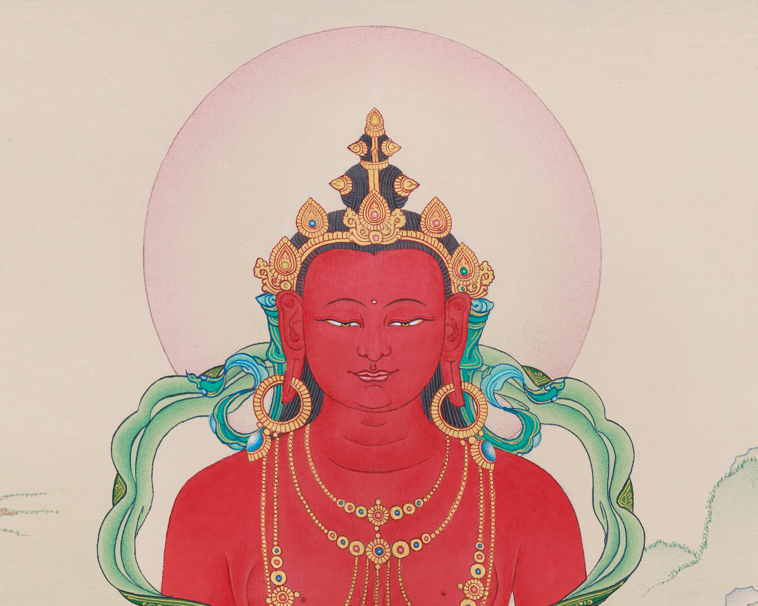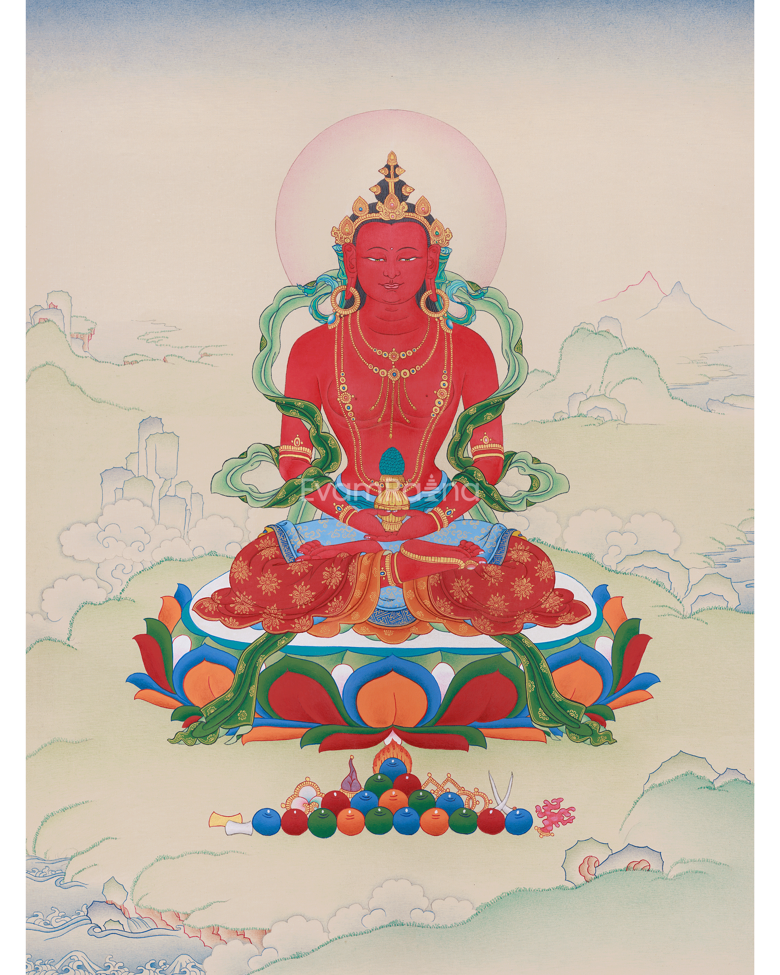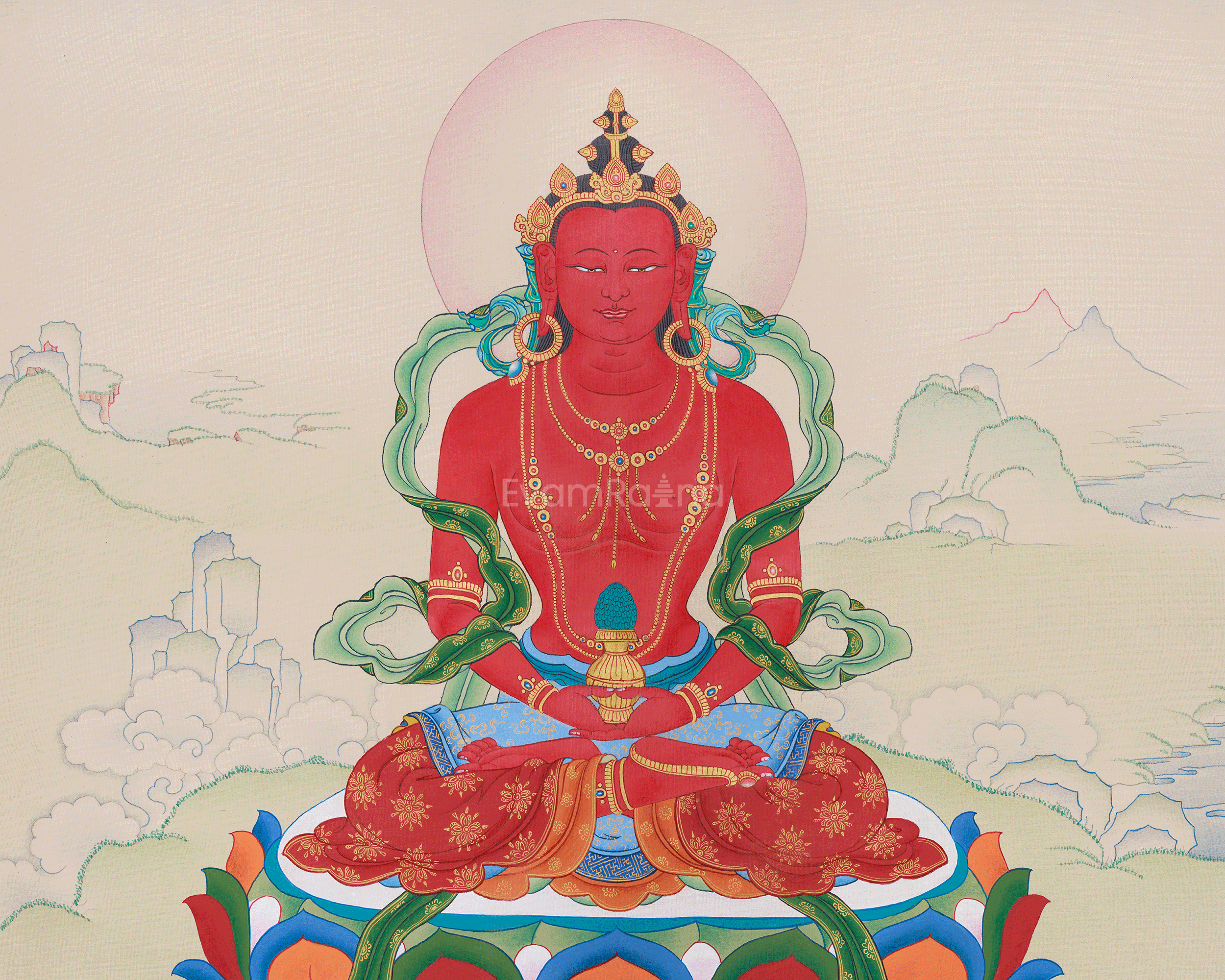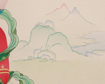 In this thangka, Amitayus Buddha is depicted seated upon a radiant lotus throne, holding a nectar vase in both hands, symbolizing the essence of long life, healing, and spiritual blessings. His serene expression radiates tranquility, while the golden halo and subtle lotus motifs surrounding him amplify his sacred presence. The harmonious background of mountains reflects the expansive and peaceful nature of Amitayus’s blessings.
